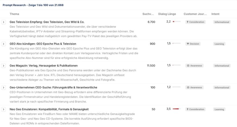 Das klassische Suchvolumen basiert auf historischen Daten: Wie oft wurde exakt die Phrase „Beste Cloud-Software“ in das Suchfeld getippt? Bei KI-Plattformen zersplittert dieses Volumen in Millionen individueller Prompts. Nutzer formulieren ganze Absätze, geben persönlichen Kontext oder stellen hochspezifische Bedingungsketten auf. Ein SEO-Tool, das für ein Keyword ein Volumen von „0“ anzeigt, ist bei GEO blind: Das Thema kann in KI-Dialogen massiv präsent sein, wird aber durch die individuelle Sprache der Nutzer für klassische Keyword-Datenbanken unsichtbar. Statt einzelner Keywords müssen wir Themen und Suchintentionen ganzheitlich betrachten. Das macht die Contentarbeit wesentlich aufwendiger, als nur Keywordlisten abzuarbeiten.