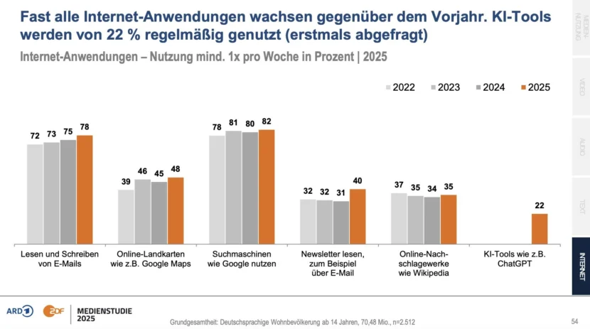 40 Prozent der Menschen in Deutschland lesen mindestens einmal pro Woche einen Newsletter. Und damit mehr als die Wikipedia und fast doppelt so häufig wie KI-Tools genutzt werden.
