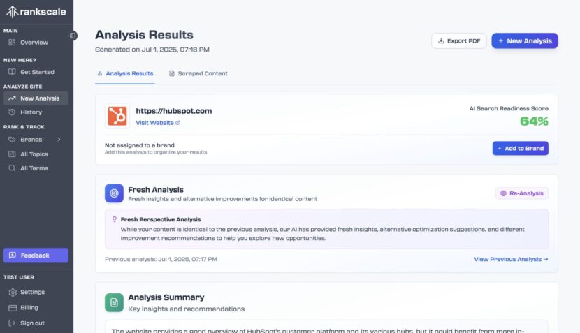 Zum Einstieg bietet Rankscale eine kostenlose Analyse an. Dabei wird eine beliebige Website-URL eingegeben. Das System generiert automatisch passende Prompts (Suchanfragen) für verschiedene KI-Engines und prüft, ob und wie die Website in den generierten Antworten erscheint. Das Ergebnis umfasst: