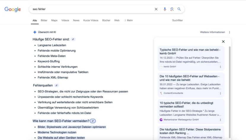 Zudem zeigt Google seit Ende März KI Übersichten als Suchergebnisse an und beantwortet viele Fragen direkt und ohne Klick auf Webseiten.