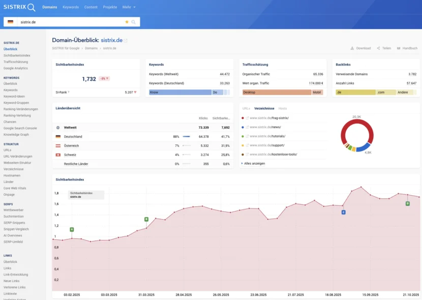 SISTRIX ist eine webbasierte SEO-Toolbox, die Nutzern Zugriff auf eine Vielzahl von Daten rund um Google-Rankings, Keywords, Wettbewerber, Backlinks und technische Optimierung bietet. Die Daten werden laufend aktualisiert, über ein Dashboard visualisiert und sind für viele europäische Märkte verfügbar.